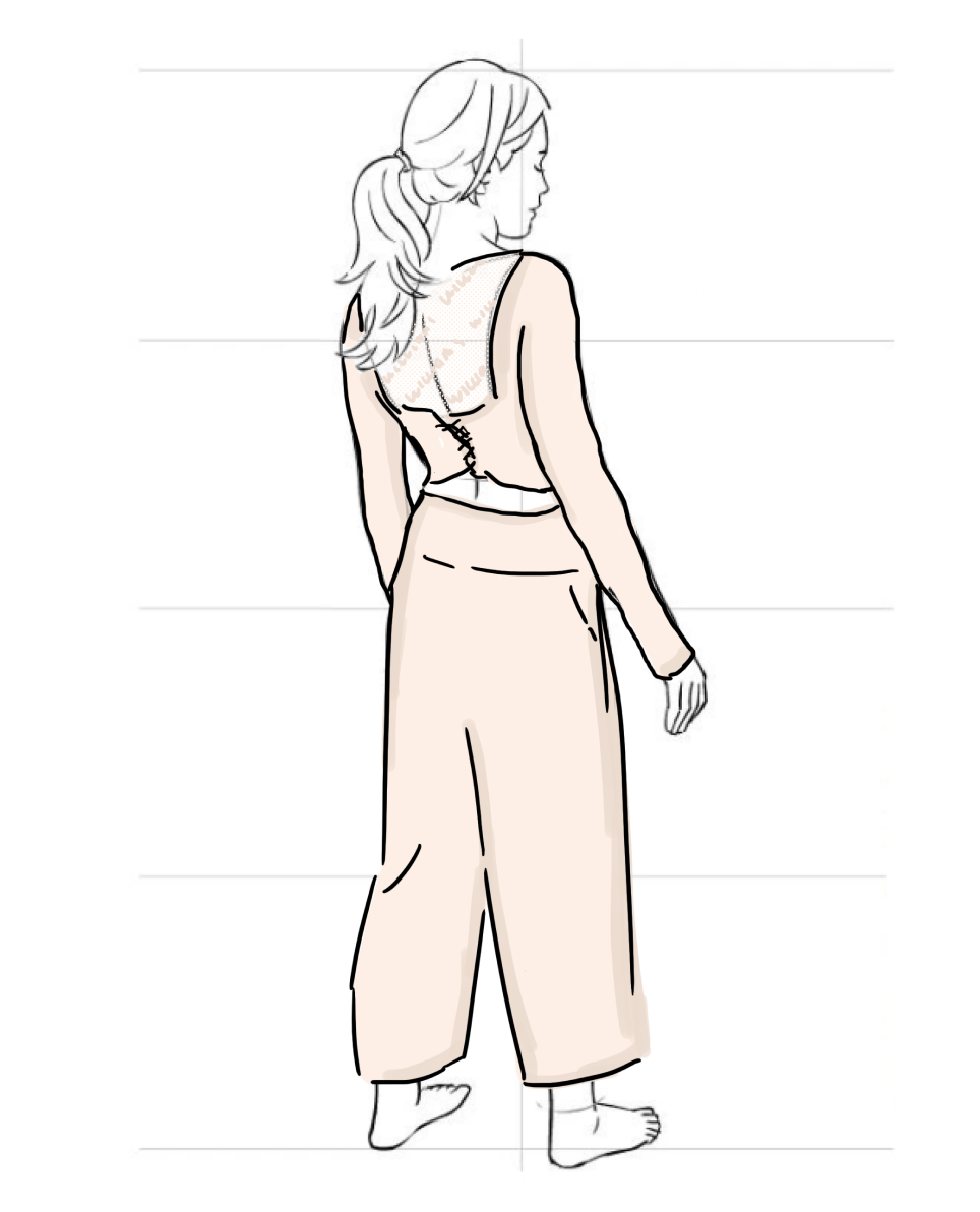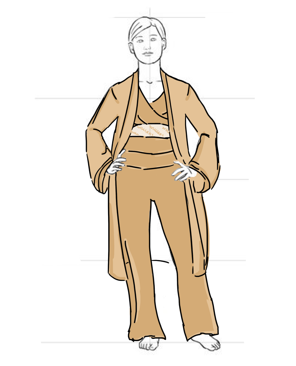1. Wir kreieren 5 verschiedene Oberteile (kurzärmelig, langärmelig, schmal, breit, mit breiten Trägern usw.), so dass eine Frau die auswählen kann, die ihr am besten gefällt. Wir kreieren 3-4 passende Unterteile (Hosen, 7/8 Hosen, Shorts etc), um sie zu kombinieren mit. Sie kann einen Hausmantel oder Bademantel hinzufügen, um sich an kühlen Abenden aufzuwärmen